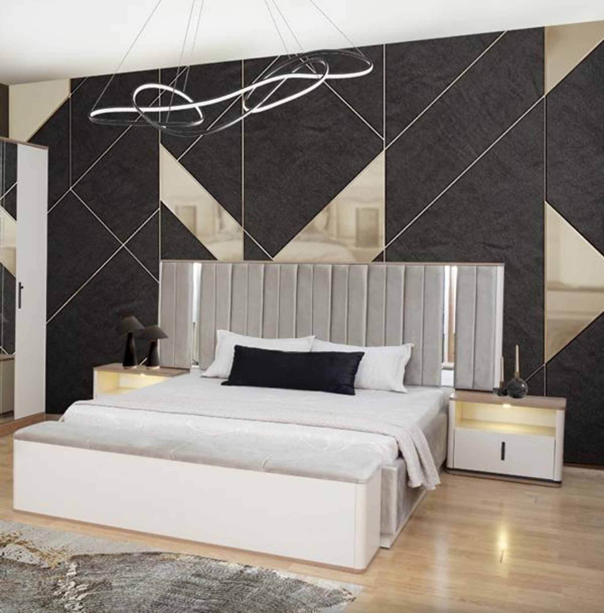 Bett Bank 2x Nachttische Kleiderschrank Verspiegelt Weiß Schlafzimmer 5tlg