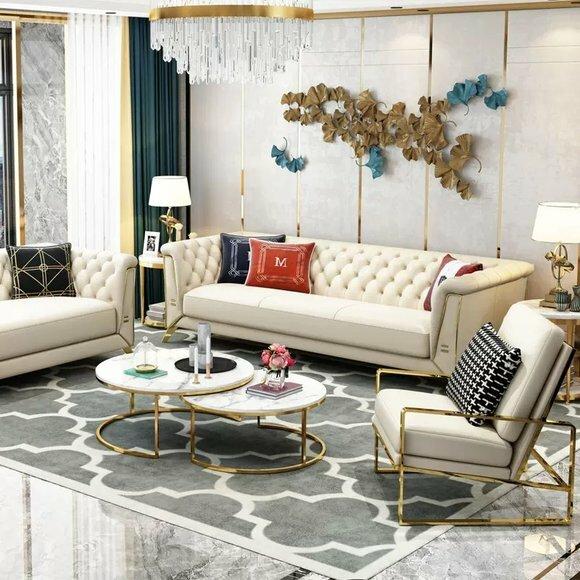 Eleganz trifft auf moderne Akzente – entdecken Sie unsere Chesterfield-Möbel mit Edelstahl-Elementen! Klassische Chesterfield-Sofas, Sessel und Hocker erhalten durch glänzende Edelstahlfüße und -details eine zeitlose, luxuriöse Note. Perfekt für stilvolle Wohnräume!