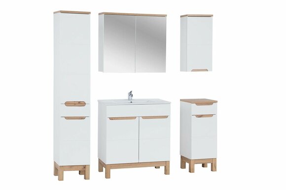 Unser Waschtisch-Set bietet Ihnen die Möglichkeit, Ihr Badezimmer nach Ihren individuellen Bedürfnissen zu gestalten. Sie können uns jederzeit direkt kontaktieren und wir stehen in ständigem Austausch mit Ihnen! Das Set umfasst einen Waschtisch (L: ca. 80 cm, H: ca. 84 cm, T: ca. 45 cm), drei Schränke in verschiedenen Größen sowie einen Schrank mit Spiegel. Maße: Schrank 1 - L: ca. 35 cm, H: ca. 187 cm, T: ca. 33 cm; Schrank 2 - L: ca. 35 cm, H: ca. 86 cm, T: ca. 33 cm; Schrank 3 - L: ca. 35 cm, H: ca. 70 cm, T: ca. 20 cm; Schrank mit Spiegel - L: ca. 80 cm, H: ca. 70 cm, T: ca. 20 cm. Optional verfügbar: freistehende Armatur, passender Siphon, passende Kopfstützen.