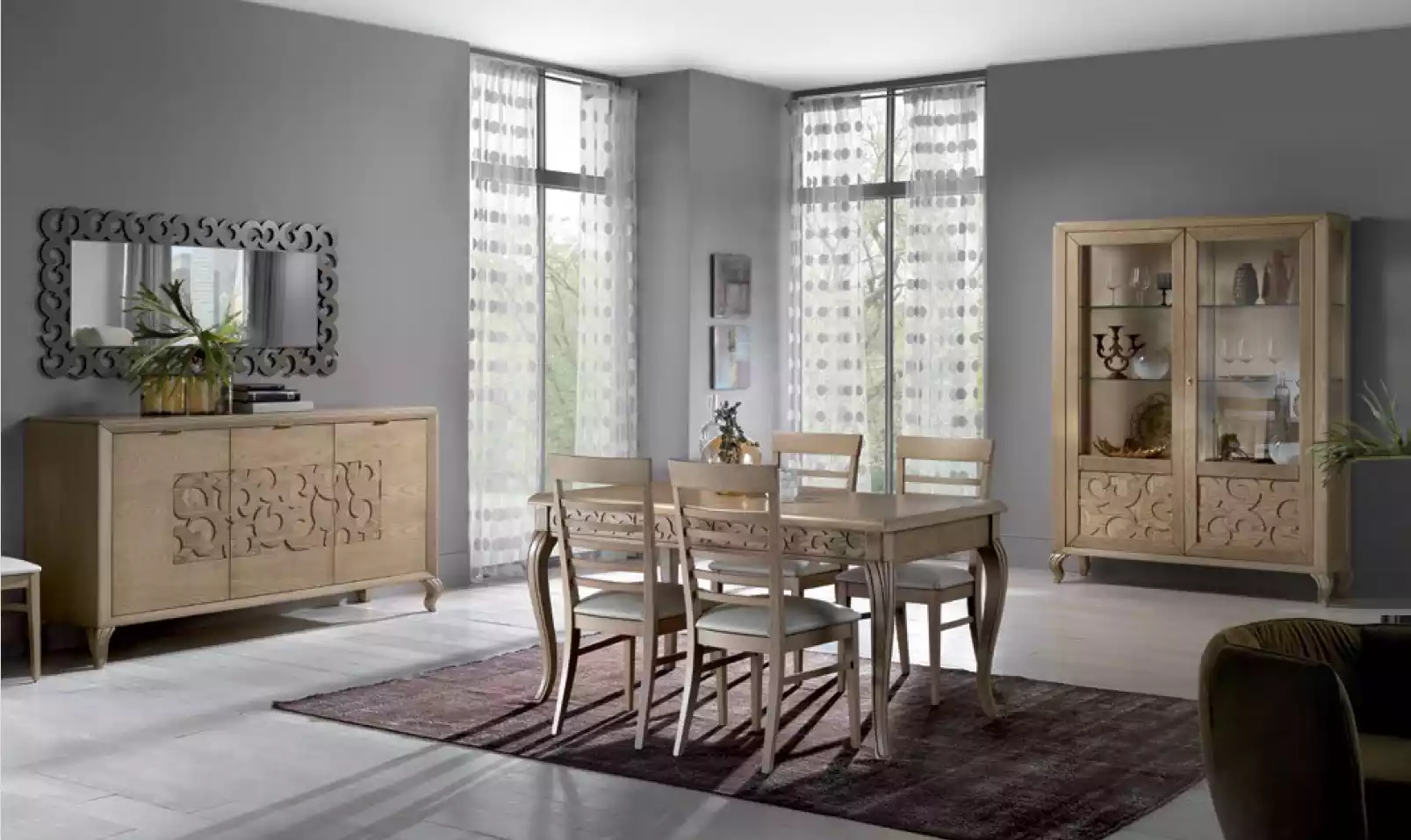 Unser Design Esszimmer Set ist die perfekte Ergänzung für Ihr Zuhause. Das Set umfasst einen eleganten Esstisch, vier stilvolle Stühle, ein geräumiges Sideboard, einen eleganten Spiegel und eine elegante Vitrine. Der Auftrag kann an Ihre individuellen Bedürfnisse angepasst werden. Die Maße der einzelnen Elemente sind wie folgt: