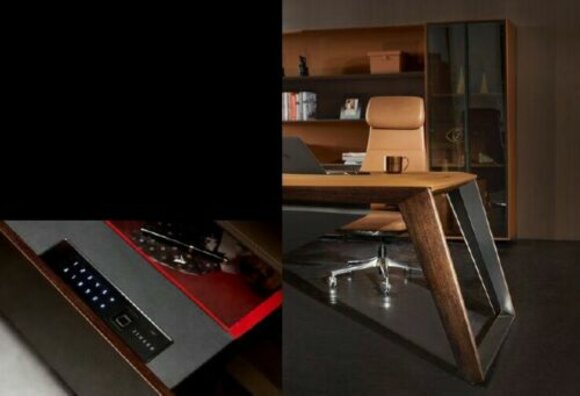 Der Eckschreibtisch kann auf Ihre individuellen Bedürfnisse zugeschnitten werden. Mit einer Länge von ca. 250 cm, einer Höhe von ca. 77 cm und einer Tiefe von ca. 219 cm bietet er ausreichend Platz für Ihre Arbeitsutensilien. Der dazu passende Sessel ist ca. 63 cm lang, 120-130 cm hoch und hat eine Tiefe von ca. 62 cm. Beide Möbelstücke sind in der Farbe wie abgebildet erhältlich und aus hochwertigem MDF + NubukLeder, MDF + Furnier sowie Edelstahl mit Passwortsperre gefertigt. Für mehr Informationen und individuelle Anpassungen kontaktieren Sie uns direkt!