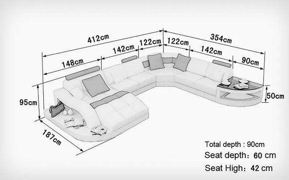 Unser Produkt ist ein hochwertiges Möbelstück, das individuell auf Ihre Bedürfnisse zugeschnitten werden kann. Mit Maßen von ca. 187 x 412 x 354 cm oder 354 x 412 x 187 cm in der Länge, ca. 95 cm in der Höhe, ca. 95 cm in der Tiefe, einer Sitzhöhe von ca. 42 cm und einer Sitztiefe von ca. 60 cm bietet es ausreichend Platz und Komfort. Freuen Sie sich auf freie Farbwahl und hochwertiges Material aus Premium Lederfaserstoff (70% Leder / 30% Polyester).