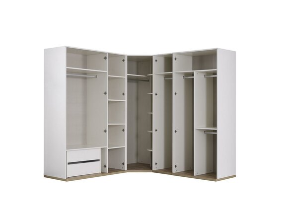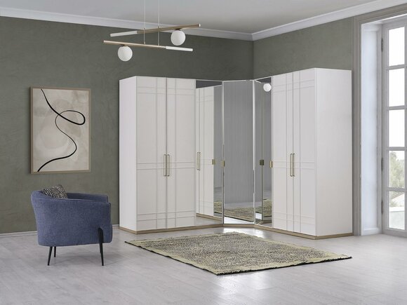 Der Eckschrank Kleiderschrank ist ein geräumiges Möbelstück, das sich ideal für Ihr Zuhause eignet. Mit sieben Türen und einem Spiegel bietet dieser Schrank viel Stauraum für Ihre Kleidung und Accessoires. Die weiße Farbe und das Holzmaterial verleihen ihm einen zeitlosen und eleganten Look. Die Maße des Schranks betragen ca. 229 x 229 x 213 cm (Länge x Breite x Höhe), mit einer Tiefe von ca. 61 cm.