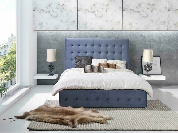 Klassisches Bettgestell mit blauem Polster, ideal für ein luxuriöses Bettdesign im Hotel. Das Gestell ist aus hochwertigem Textil gefertigt und bietet ausreichend Platz für Doppelbetten. Die Maße sind individuell wählbar, mit einer Matratzenaufliegefläche von ca. 140/160/180/200 x 200 cm oder 160 x 200 cm (Bettmaß ca. 181 x 223 x 138 cm). Die Länge beträgt ca. 223 cm, die Höhe ca. 138 cm und die Tiefe ca. 181 cm. Optional sind im Shop eine Matratze für 299 Euro, ein Lattenrost für 119 Euro und ein Hebesystem mit Bettkasten für 499 Euro erhältlich. Die Farbe des Gestells kann frei gewählt werden und das Material ist Premium Kunstleder oder Stoff aus verschiedenen Gruppen.