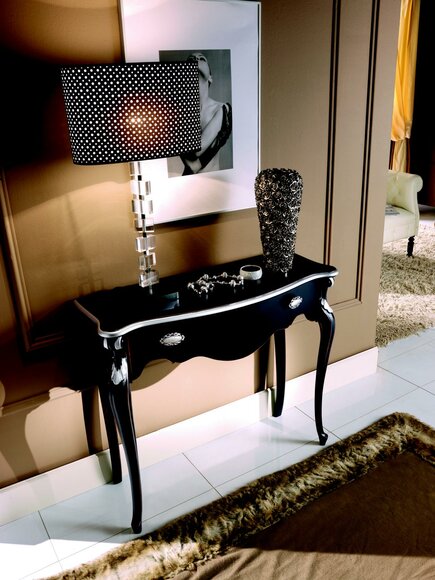 Der Konsolentisch Schwarze Konsole aus italienischem Design kann auf Ihre individuellen Bedürfnisse zugeschnitten werden. Mit Maßen von ca. 93 cm Länge, 80 cm Höhe und 36 cm Tiefe bietet er ausreichend Platz für Ihre Gegenstände.