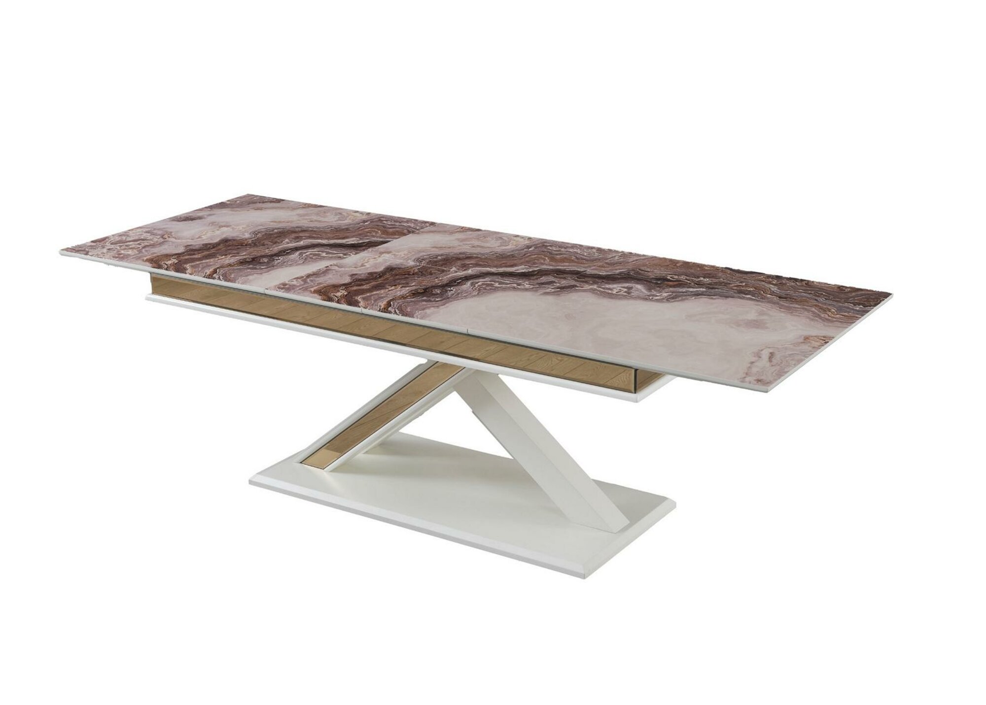 Entdecken Sie den Luxus Esstisch, der ideal für Ihr Esszimmer ist. Mit einem modernen und zeitgenössischen Design bringt dieser ausziehbare Tisch Eleganz in Ihr Zuhause. Er besteht aus MDF/Spanplatte und hat eine stilvolle weiße Farbe mit einer hochwertigen Marmor-Tischplatte. Die Abmessungen von 180 x 95 x 77 cm bieten ausreichend Platz für Ihre Gäste, während die X-Tischbeine für zusätzliche Stabilität sorgen. Die maximale Länge beträgt 180 cm, sodass Sie den Tisch nach Bedarf erweitern können.