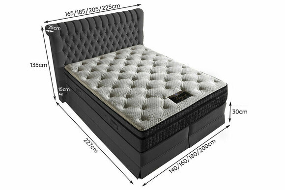 Das Luxus Schlafzimmer Bett ist ein elegantes Doppelbett, das speziell für Hotelanwendungen entworfen wurde. Mit dem Polster Design und den luxuriösen Materialien bietet es höchsten Komfort und Stil. Die Maße des Bettes sind variabel, mit einer Matratzenaufliegefläche von ca. 140/160/180/200 x 200 cm. Die Länge beträgt ca. 227 cm, die Höhe ca. 135 cm und die Tiefe ca. 165 cm.