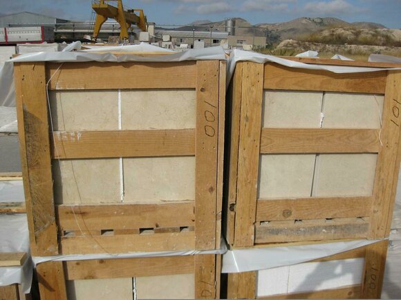 Die Platten haben ein Maß von 40x40cm und eine Dicke von 2cm, was einer Fläche von 0,16m² pro Platte entspricht. Insgesamt ergibt sich bei 263 Platten eine Gesamtfläche von 42,08 m². Unser Marmor in der Farbe Crema Marfil (Beige) besticht durch eine polierte Oberfläche und jedes Stück zeichnet sich durch individuelle Marmorierung aus. Mit einem Gewicht von ca. 55kg pro Quadratmeter bieten wir Ihnen auch Maßanfertigungen für Treppen, Auftritte, Wandverkleidungen, Kamine und Waschtischplatten an. Gerne erstellen wir Ihnen ein Angebot ab Werk basierend auf einer CAD-Skizze.