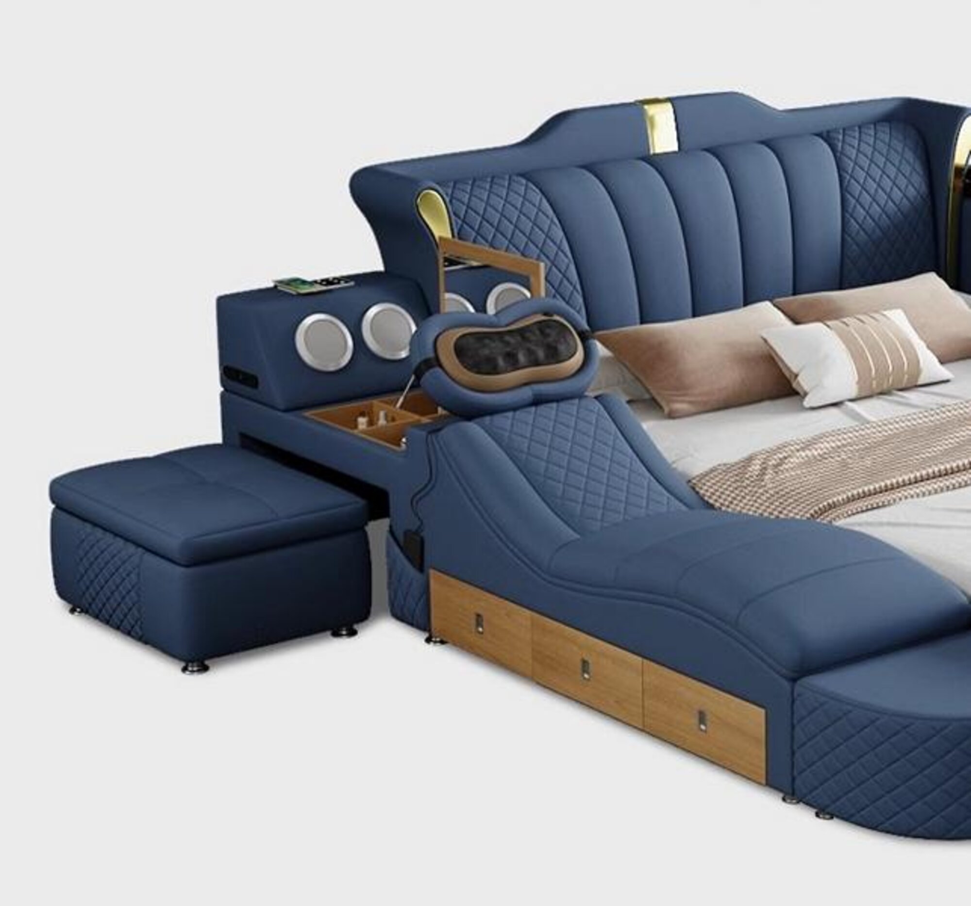 Entdecken Sie das **Multifunktion Betten Bett Sofa**, ein wahres **All-in-One** Möbelstück, das nicht nur als **Doppelbett** dient, sondern auch zahlreiche Funktionen bietet. Mit einer großzügigen **Liegefläche von 180 x 200 cm** und einem stilvollen **blauen Kunstlederbezug** ist dieses **moderne** Design ein Blickfang in Ihrem **Schlafzimmer**. Aus robustem **Holz** gefertigt, überzeugt es mit einer Länge von **245 cm** und einer Breite von **265 cm**, ideal für jede Raumsituation. Zudem verfügt das Bett über praktische Features wie **Bluetooth**, einen eingebauten Nachttisch, einen Schreibtisch und sogar einen Massagesessel.