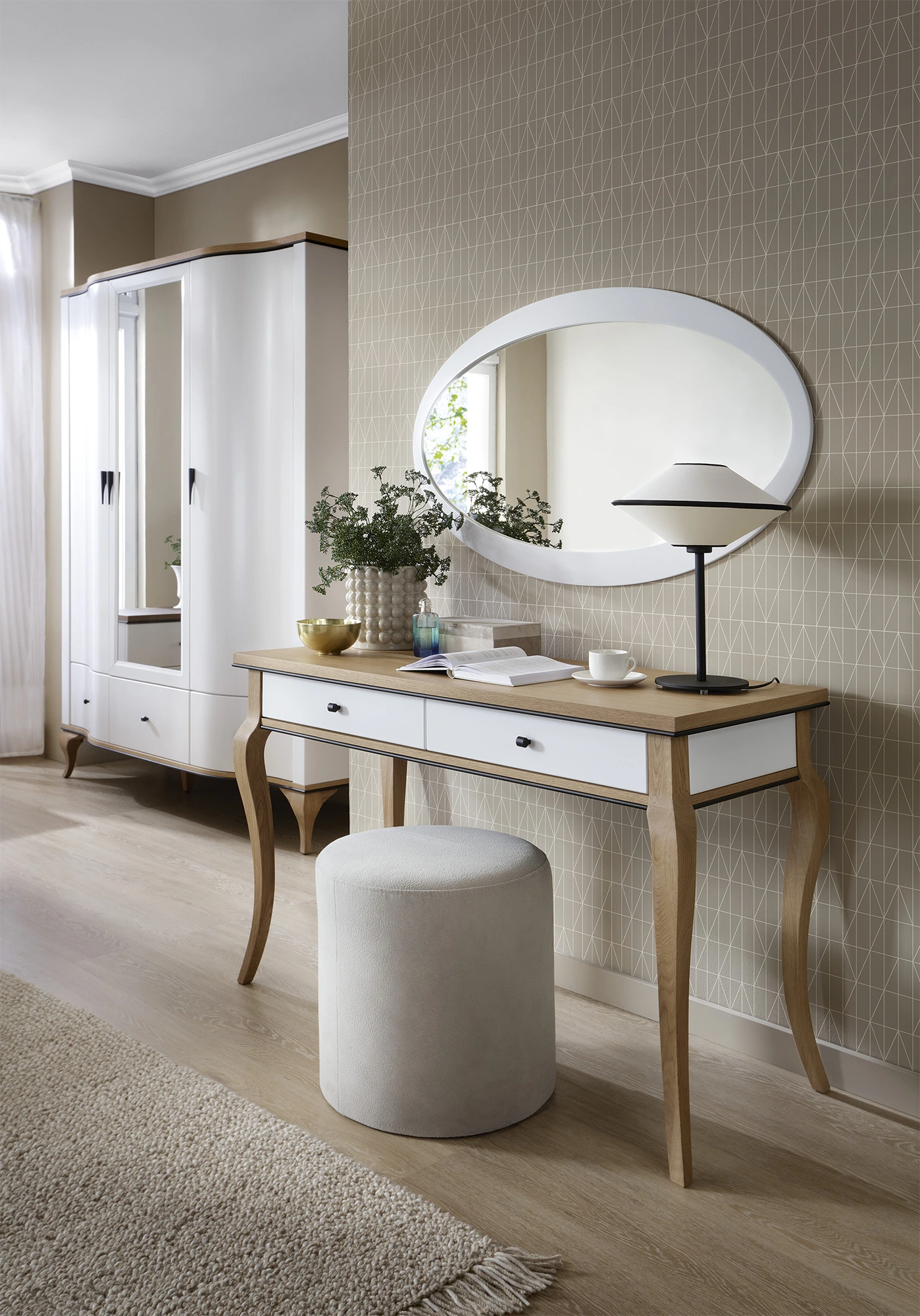 Der Schminktisch besticht durch seine warme, braune Tischplatte und ist mit zwei weißen Schubladen ausgestattet, ideal für die Aufbewahrung von Make-up, Schmuck oder anderen persönlichen Gegenständen. Der dazugehörige ovale Spiegel in einem eleganten, weißen Rahmen rundet das Design ab und sorgt für eine stilvolle Atmosphäre im Raum.