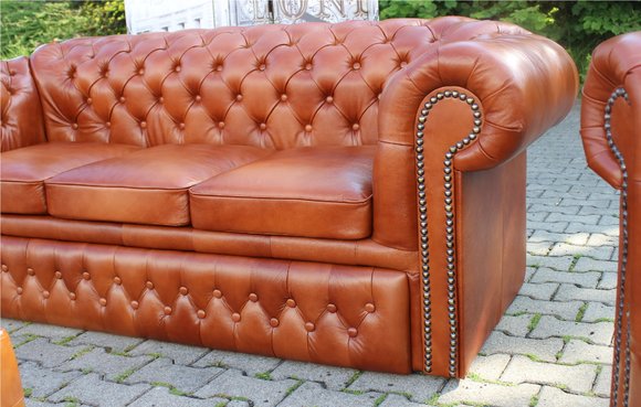 Das Chesterfield Sofa ist ein elegantes Sofa-Set, das Ihren individuellen Bedürfnissen angepasst werden kann. Die Sofagarnitur besteht aus einem 3-Sitzer, einem 2-Sitzer, einem 1-Sitzer und einem Hocker. Jedes Element hat spezifische Maße, die sich perfekt in Ihr Wohnzimmer einfügen: Der 3-Sitzer ist etwa 210 x 90 x 80 cm groß, der 2-Sitzer 165 x 90 x 80 cm und der 1-Sitzer 118 x 90 x 80 cm. Die Vollleder-Polsterung sorgt für ein luxuriöses Aussehen und ein angenehmes Sitzgefühl.