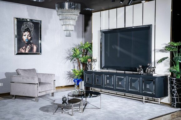 Unser Wohnzimmer TV-Schrank ist ein hochwertiges Möbelstück, das für Ihre individuellen Bedürfnisse angepasst werden kann. Mit Maßen von ca. 260 x 60 x 50 cm bietet unser TV-Ständer aus Holz mit Metallrahmen ausreichend Platz für Ihren Fernseher und zusätzliche Geräte. Die Farbe des Schrankes ist klassisch Schwarz und passt perfekt in jedes Wohnzimmer.